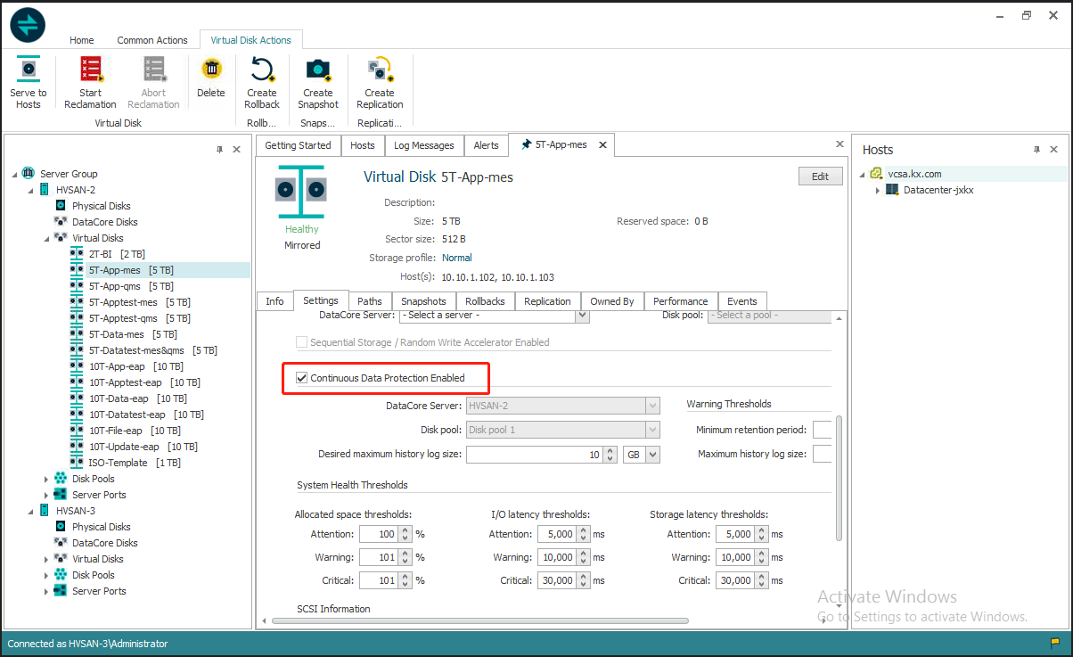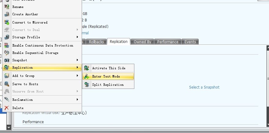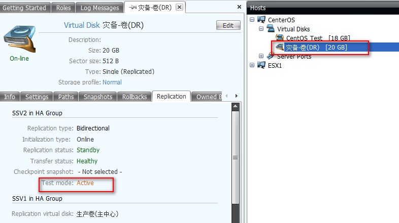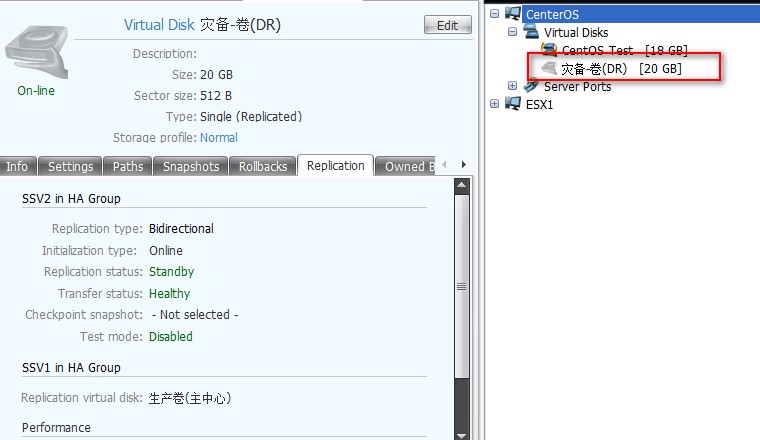 通过上图可以看出,位于远程灾备中心的“灾备卷”在映射给主机之后被自动锁死,设置为灰色不可用访问状态。这和大多数产品一样,为了避免与实时汇入新数据造成读写冲突。