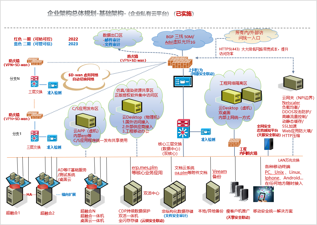1)2节点双活数据中心承载集团所有工厂集团共享系统: oa,hr,bi,erp,plm,mdm,分布式file(深圳托管机房)