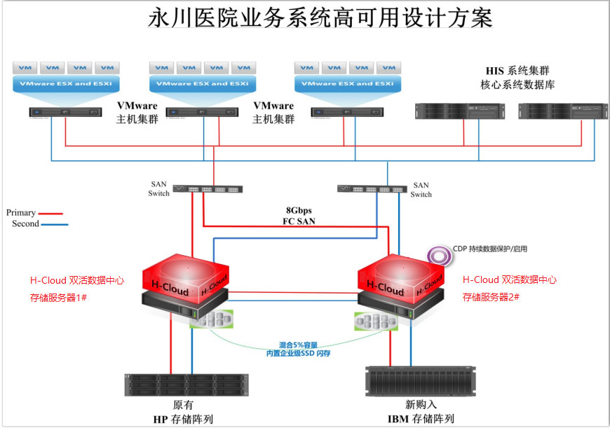 H-Cloud 致力于全球的存储安全解决方案,受益于虚拟化技术, 能够整合永川数据中心不同特征的存储阵列,包括已经在用的 DAS 及 SAN,并且在跨异构的模式下,为永川医院核心业务,OA 业务, 外网业务提供高可用性,使 RPO,RTO 目标为零。