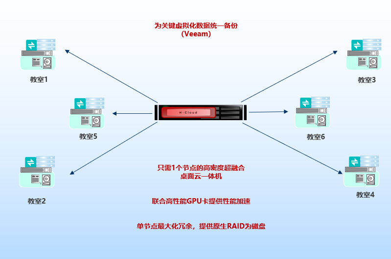 方案基于H-Cloud 超融合平台,1台普通服务器通过超融合软件,最终实现高密度VDI。