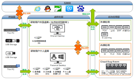 云桌面方案采用Citrix ADC和Citrix Virtual Apps andDesktops组件;围绕研发数据安全展开,研发桌面云化,实现安全域的划分,确保每个安全域的数据实现安全的出入;