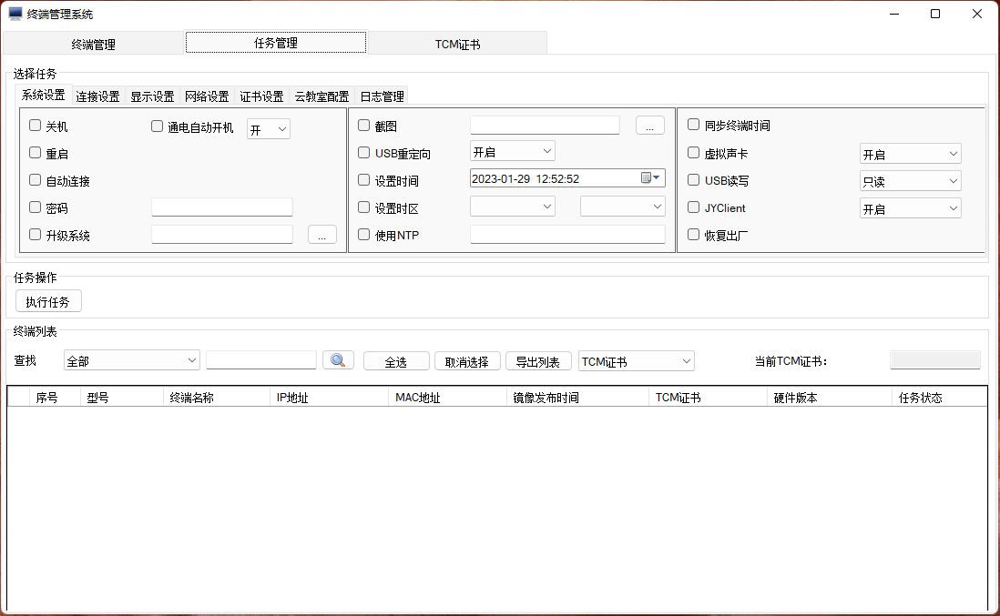 通过云终端管理系统,勾选,关机,重启等任务之后,在终端列表里选取需要操作的终端,点击执行任务即可后台统一控制。