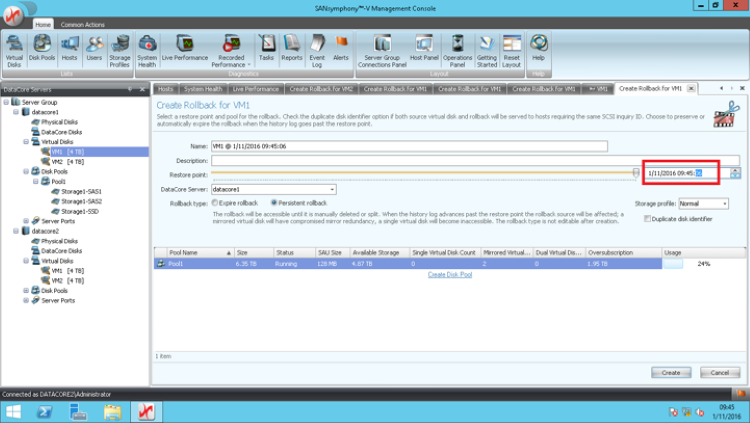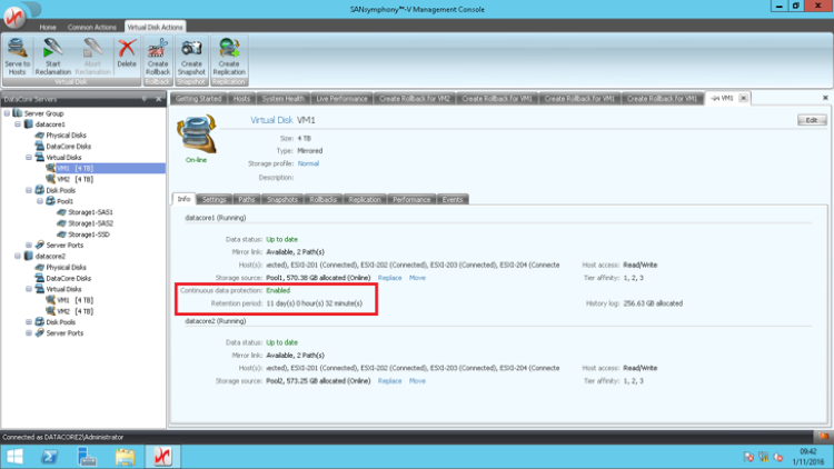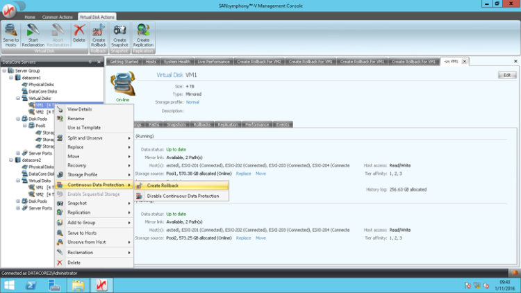2.右键单击虚拟卷,选择Continuous data protection,选择Creat Rollback可创建回滚点。