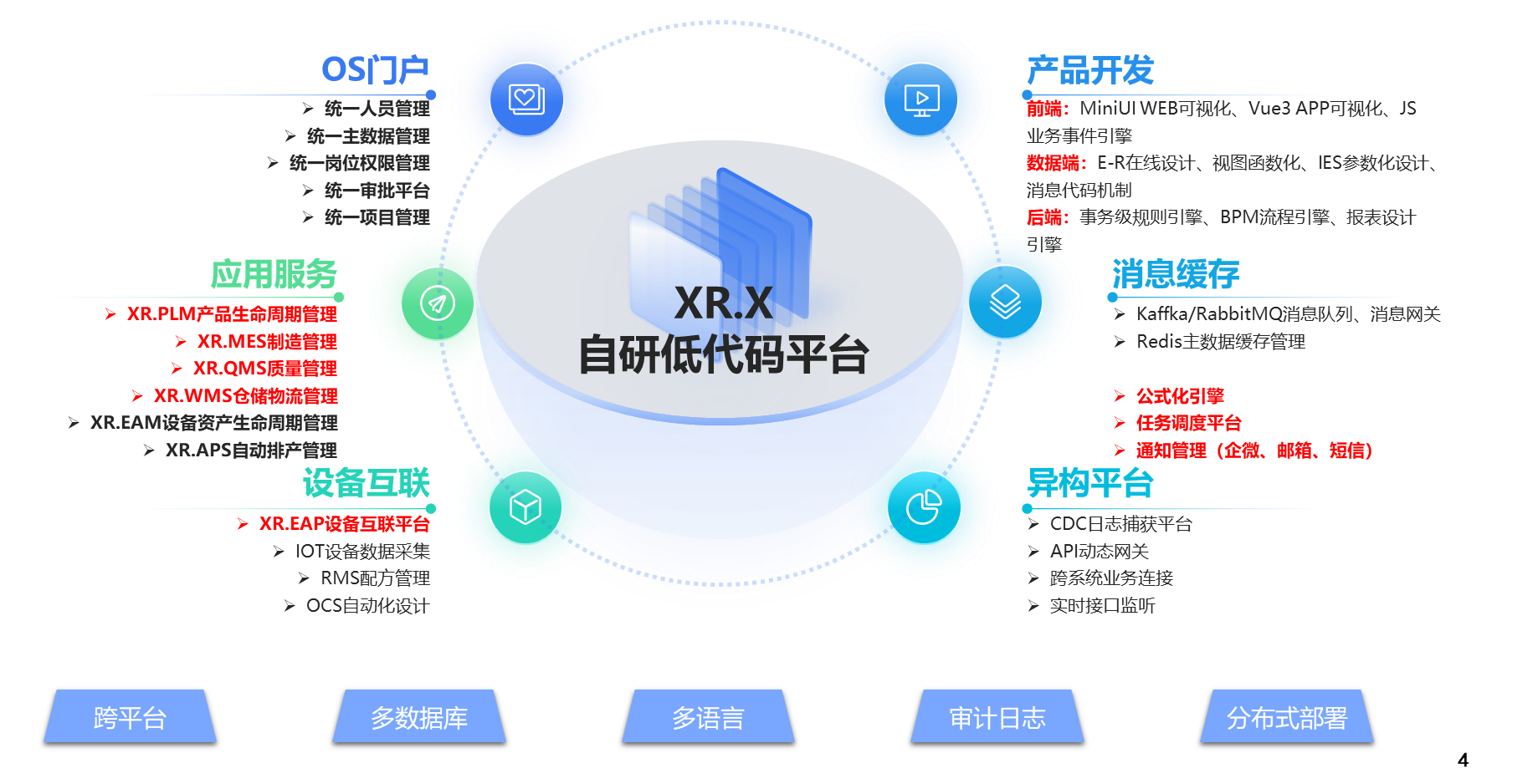 ▷自研XR.X低代码平台是企业最佳智能制造流程的执行平台,全面贯彻 “软件定义制造” 的理念,以数据驱动实现大规模个性化定制生产模式的落地。企业可通过XR.X平台的核心产品构建“可追溯性、智讯化、场景化的数字化整体解决方案”。晓软 XR-X 平台产品秉承稳定、弹性、高效、开放、易维护设计核心理念,集成微服务化弹性系统架构、开放且一致性开发平台、通用接口系统轻松整合、类低代码二次开发环境、积木式的核心系统框架、开箱即用营运管理平台6大核心优势。