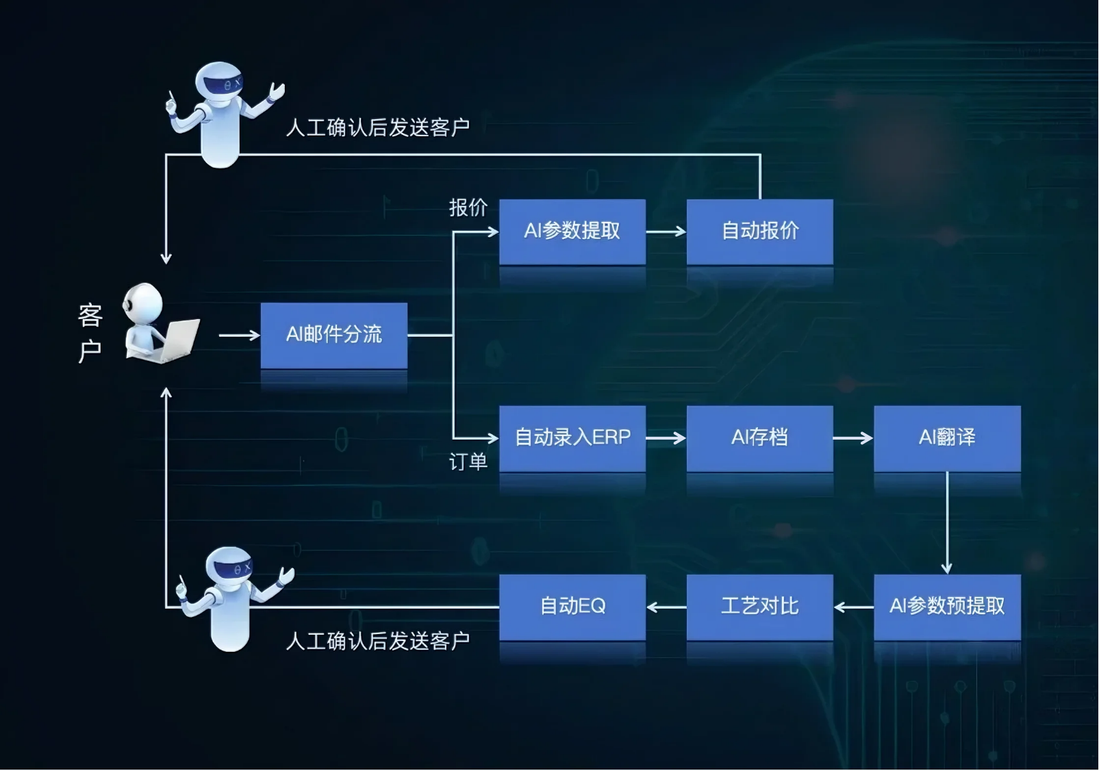 我们的AI智能体深度学习海量PCB设计数据与制造规则,可自动提取报价参数实现 AI 自动报价,缩短回复时间;精准分流订单邮件并提取参数录入 ERP,衔接订单与工程设计;快速处理订单资料进行工艺对比,生成 EQ,提升订单转化效率。