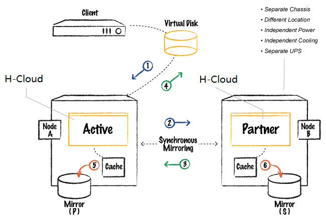 H-Cloud 存储服务器允许您配置由两个节点之间的同步镜像的冗余存储池。主节点与备援节点提供镜像虚拟卷给前端应用主机,应用主机配合本身的多路径管理软件协调 H-Cloud Server之间的首选与备选,