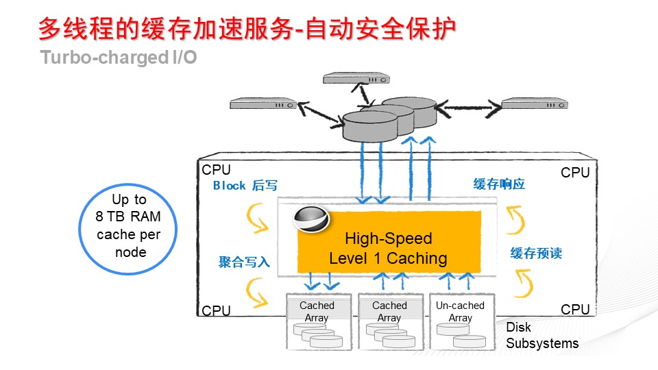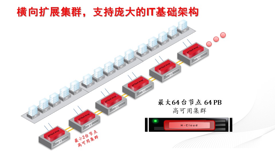 加速从现有的存储磁盘I / O响应使用x86 - 64的功能强大,价格低廉的“超级高速缓存” H-Cloud 全闪存阵列的节点的CPU和内存减少数据访问的寻道时间.