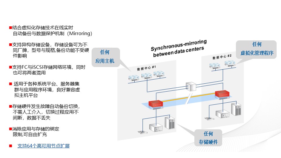 þ 通过存储阵列之间的实时镜像技术(Synchronism Mirroring),允许在线维护及替换存储阵列,应用主机不会受到中断影响。