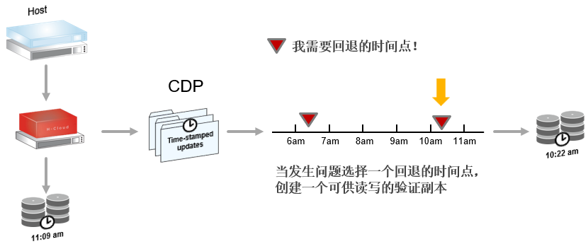 回滚到最新的快照或备份可能意味着失去大量的更新,逻辑错误发生等问题 。连续数据保护(CDP)的提供了一个严谨恢复策略,以恢复快照和备份所涵盖较长的时间间隔之间时间点。CDP的连续记录和时间戳的I / O写入到虚拟磁盘指定让您恢复到一个时间您在48小时备份周期。