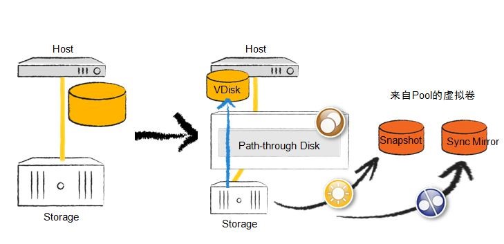 Pass-through Disk功能,允许对原有应用使用中的,文件系统,数据库结构等不干预的前提下,进行 H-Cloud 存储虚拟化网关 代理接管,并且提供给前端应用服务器,保证原有的工作。而基于上诉H-Cloud 存储虚拟化网关部署中,是把原有实体磁盘转换为H-Cloud虚拟存储网关 虚拟格式。通过Pass-through Disk 功能把原有的文件系统Mirror至另一台 H-Cloud 存储虚拟化网关 后,可以对其部署基于 H-Cloud 存储虚拟化网关 所有功能服务;而在以往的经验中, Pass-through 功能常用作 H-Cloud 存储虚拟化网关 部署之前的数据迁移;