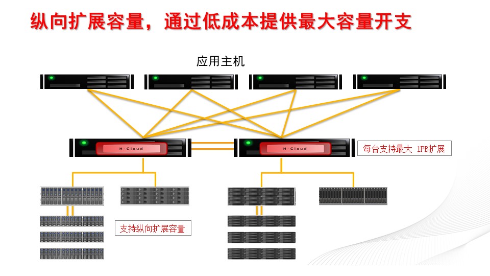 弹性架构: H-Cloud 先进的虚拟技术为存储资源无缝扩展提供了可行性。灵活的扩展性为 IT 系统打下坚实的基础。