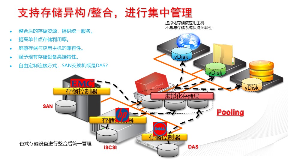 在存储技术高速发展的今天,当企业还在对不同存储架构的优劣争论不休时。赫然回首,发现企业面临的存储问题已经不再是技术本身,而是在异构的环境下,面对庞大的存储资源时,如何对资源进行有效的利用和管理。对此,H-Cloud 早已洞烛先机,通过存储虚拟化技术,打破实体存储设备间的疆界,助企业构建高弹性的存储基础架构。H-Cloud 作为存储行业技术优胜者,通过存储虚拟化技术,帮助企业以最经济的方式部署高弹性的存储基础架构。