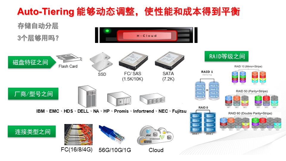 自动存储分层:通过监测I / O访问,确定其使用的频率,然后动态信息块移动到最合适的类或存储设备层。 H-Cloud 系统会自动“寻找”最常用的块,和最快的层,而最不常用的块“降级”到最慢层。只有当该层完全耗尽,将一个下层选择。