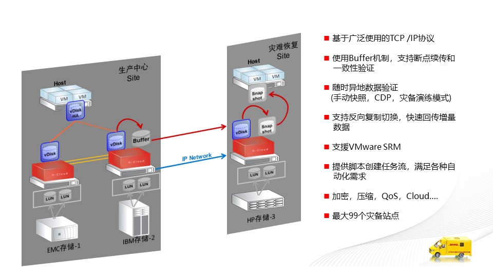 H-Cloud 同步方式容灾方案的特点是:实时容灾,无数据丢失,自动业务切换,可扩展成两个互相容灾备份的业务生产中心,多平台支持、可扩展的容灾平台。